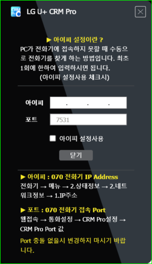 3) “아이피 설정사용”을 체크하시고 닫기 버튼을 누른 후 다시 로그인을시도합니다.